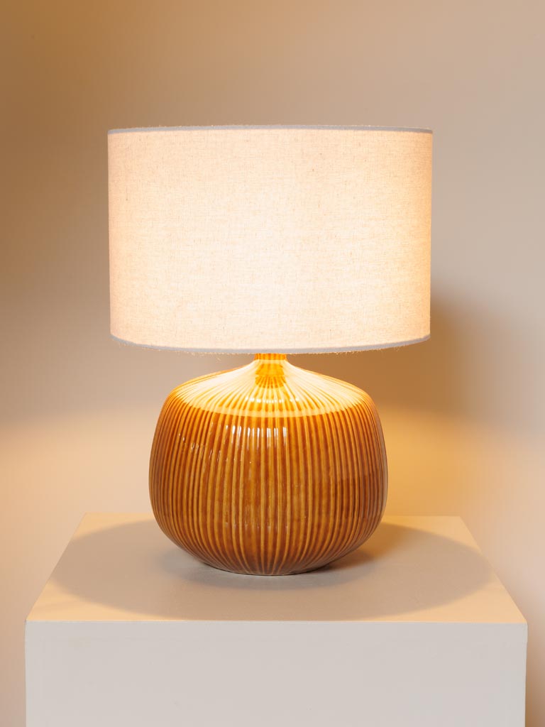 Eπιτραπέζιο κεραμικό φωτιστικό σε μουσταρδί χρώμα & αμπαζούρ από λινό εκρού ύφασμα
