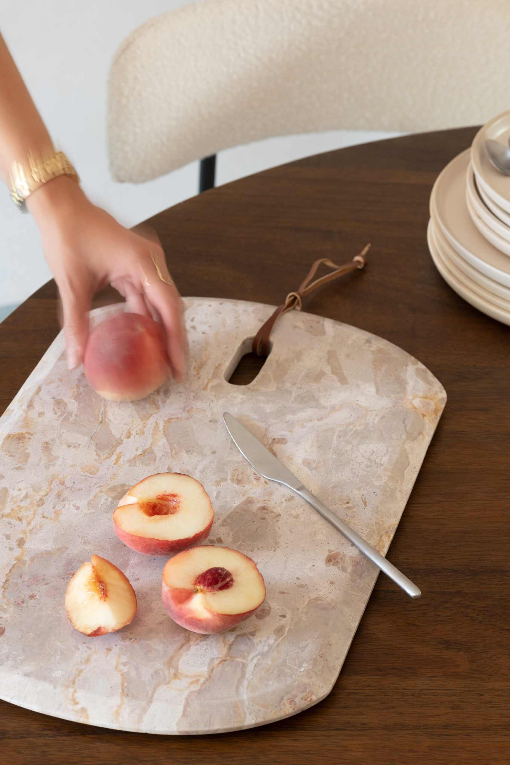 O Rene είναι ένας μαρμάρινος δίσκος κοπής, σχεδιασμένος για λειτουργικότητα και στυλ. Η λεία επιφάνεια είναι ιδανική για σερβίρισμα, ενώ οι κομψές καφέ δερμάτινες λαβές προσδίδουν μια εκλεπτυσμένη πινελιά και εύκολη χειριστικότητα. Αυτή η ανθεκτική επιφάνεια όχι μόνο βελτιώνει την αισθητική της κουζίνας σας, αλλά και εξασφαλίζει μακροζωία, καθιστώντας την απαραίτητη προσθήκη για κάθε λάτρη του φαγητού. Μεταμορφώστε την προετοιμασία και την παρουσίαση των φαγητών σας με αυτό το εκπληκτικό κομμάτι που συνδυάζει πρακτικότητα με διαχρονική κομψότητα.
