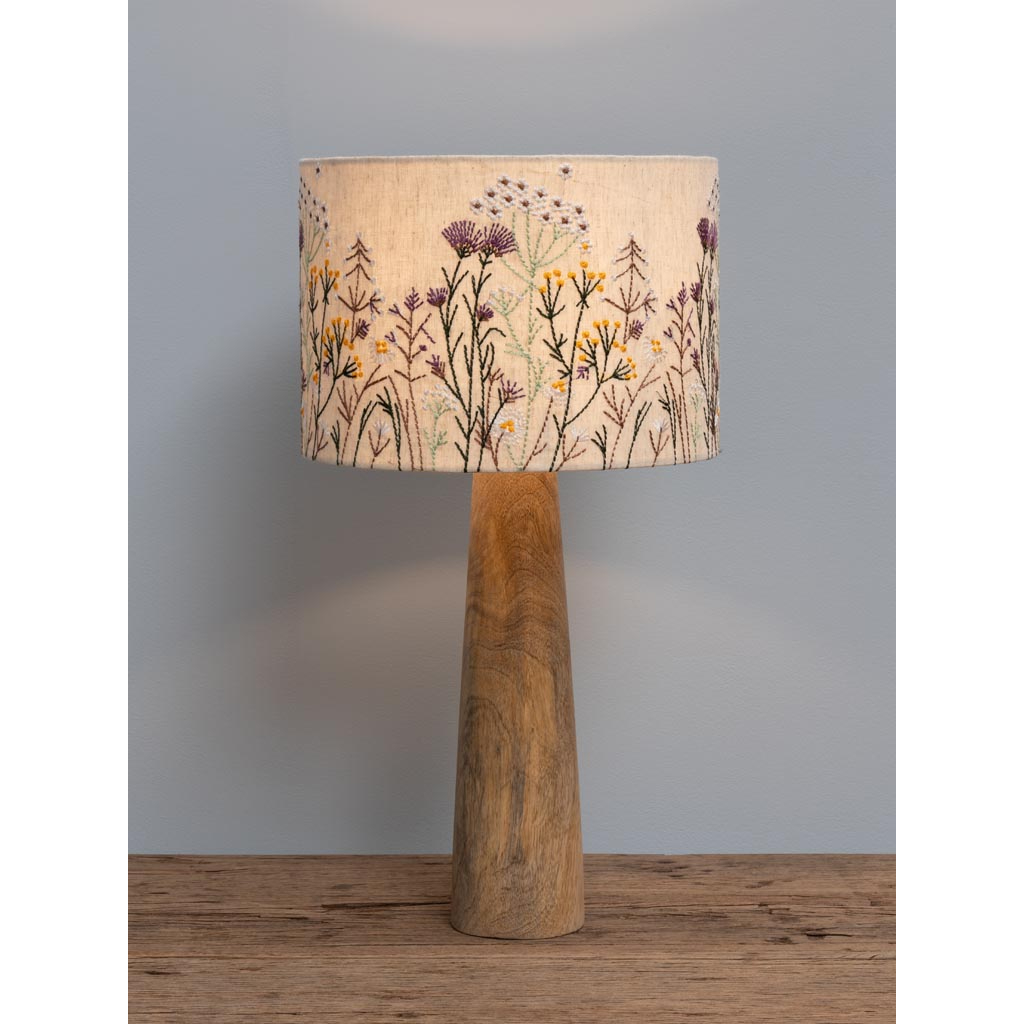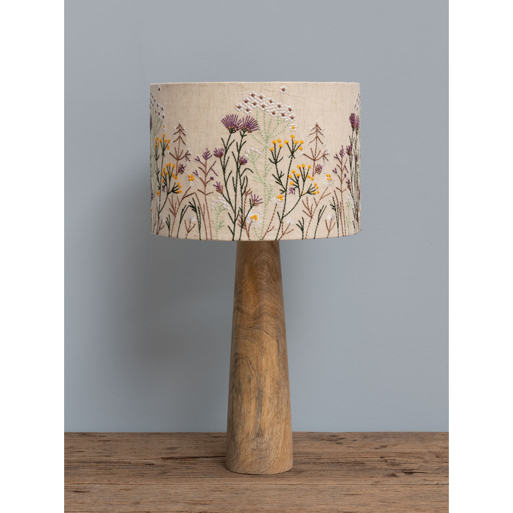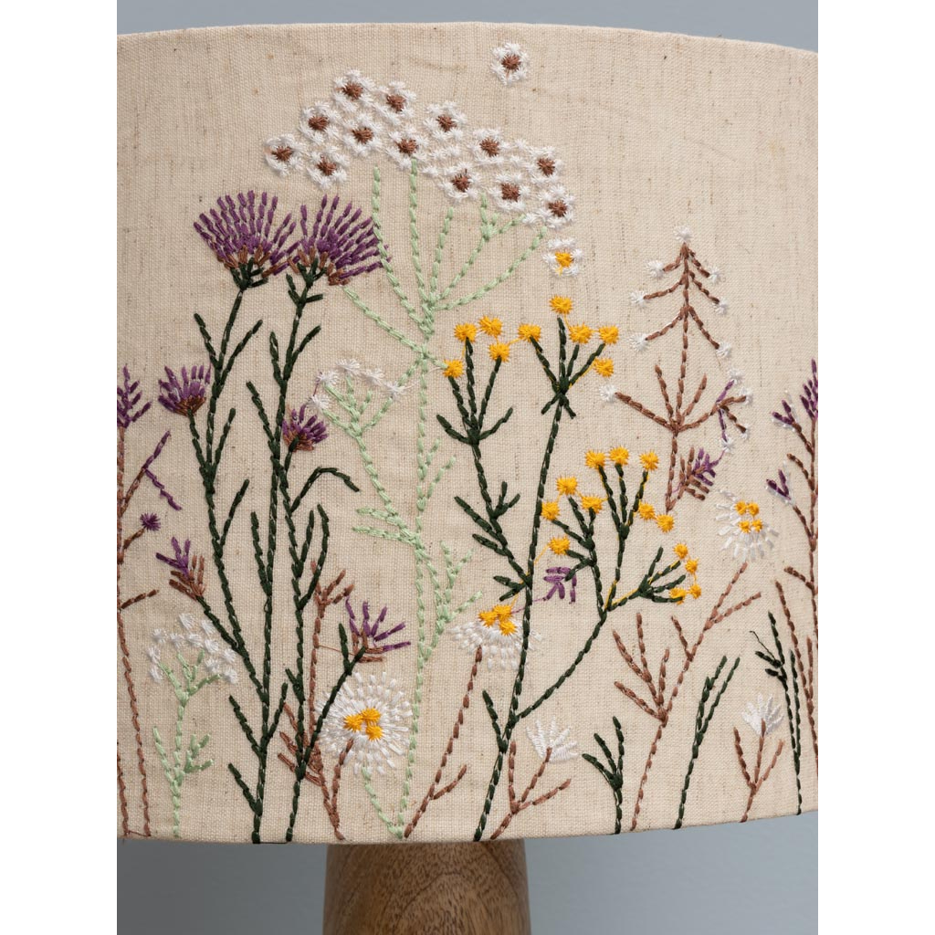Eπιτραπέζιο φωτιστικό από ξύλο μάνγκο σε φυσικό χρώμα, με βαμβακερό αμπαζούρ, κεντημένο με λουλούδια, σε μπεζ χρώμα